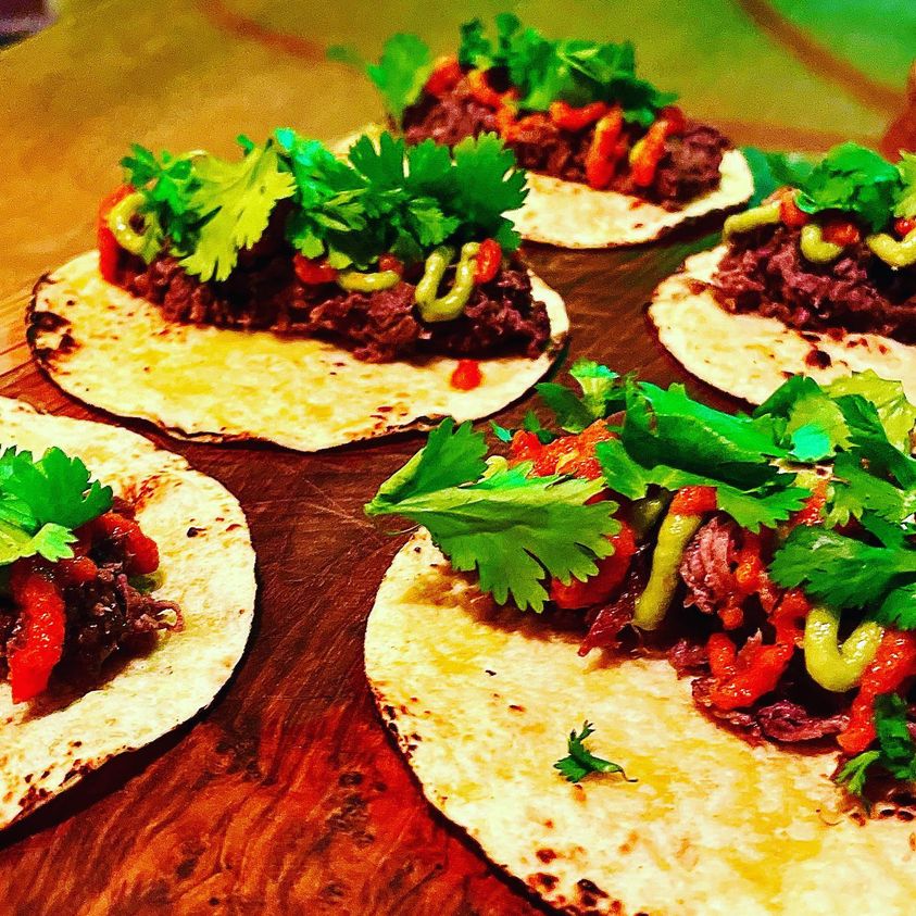 Beef, Guacamole, Red pepper Cream, Cilantro