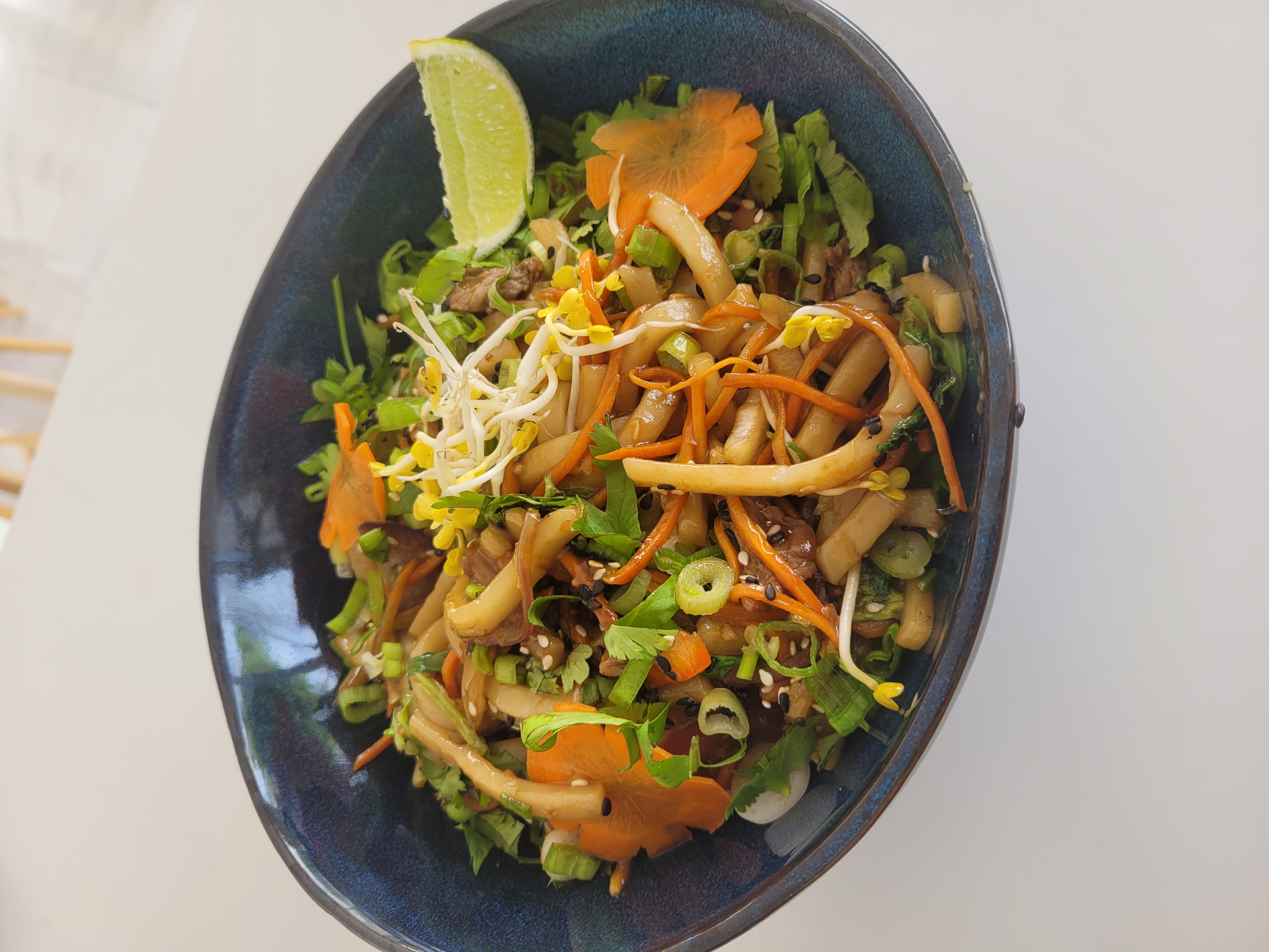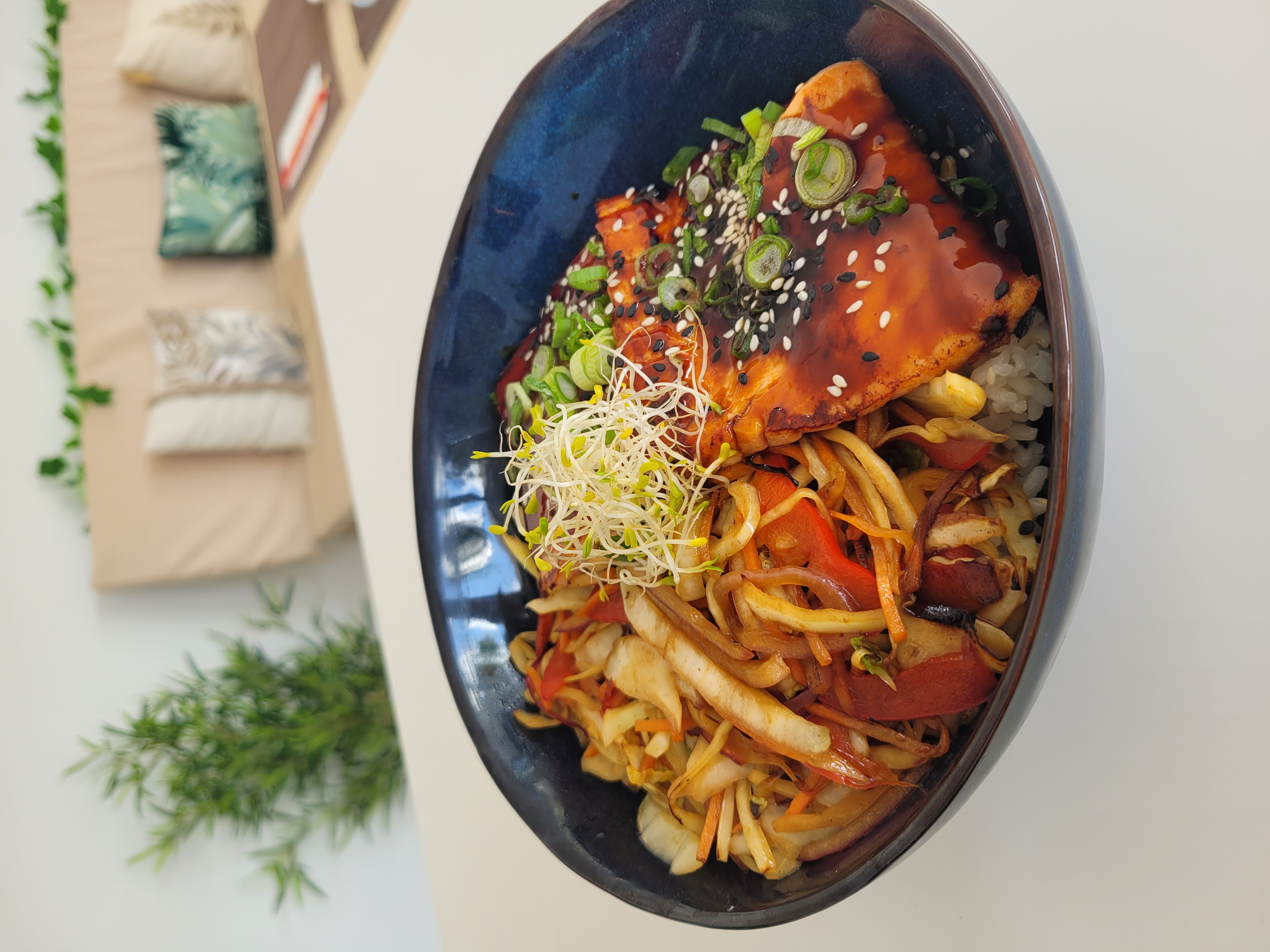 Cheese, Avocado, Grilled Salmon, Eel Sauce, Kimchi, Lemon Zest
