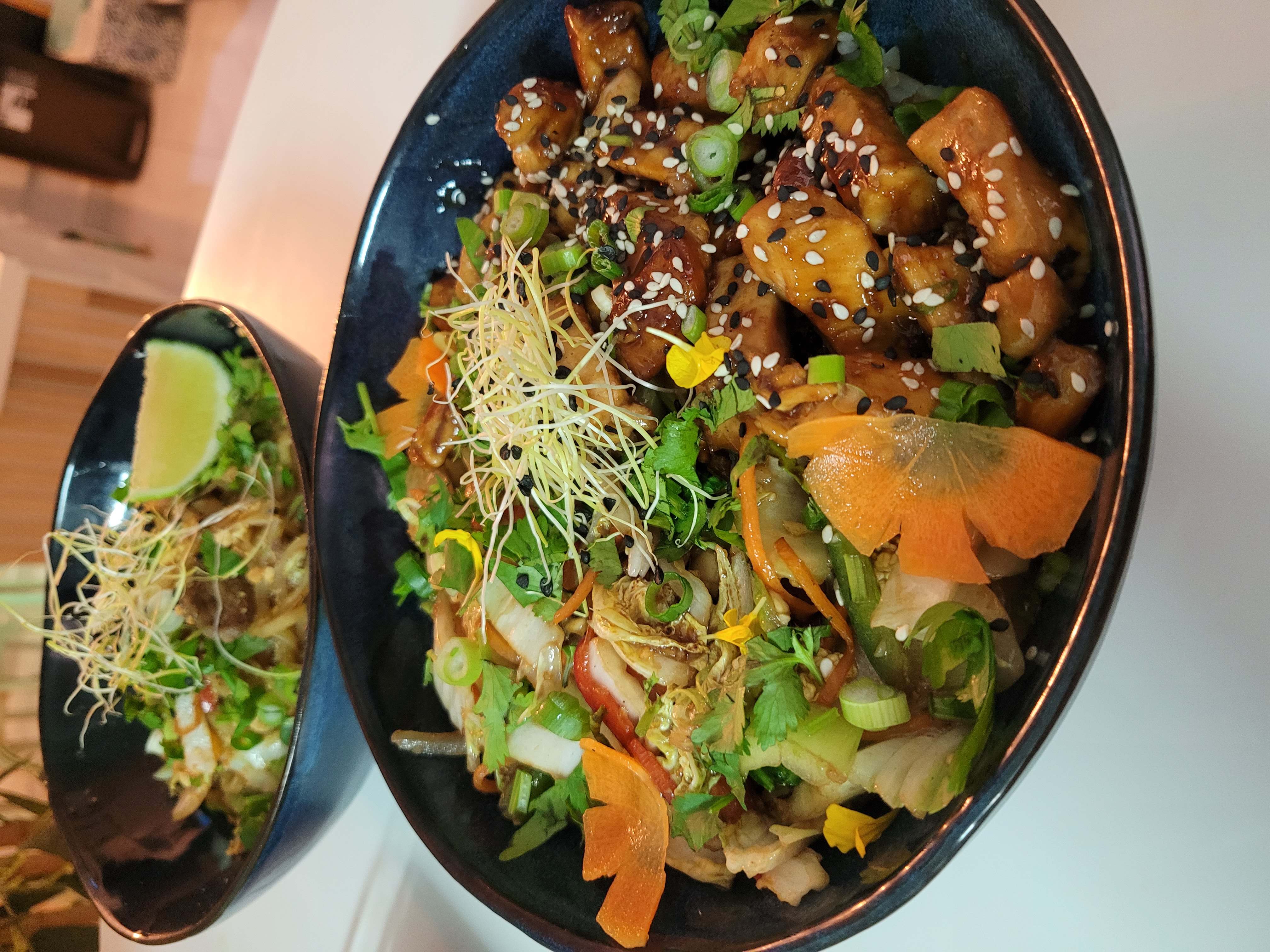 Tempura de Mahi Mahi, Avocat, Concombre. Tartare de Mahi au zeste d'agrumes et sauce kimchi.