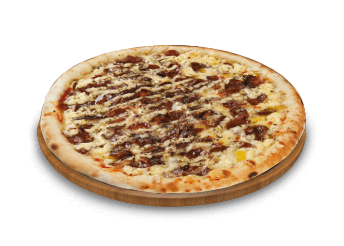 Tomato base, Mozza-Emmental, Minced meat, Peppers, BBQ sauce, Olives, Oregano