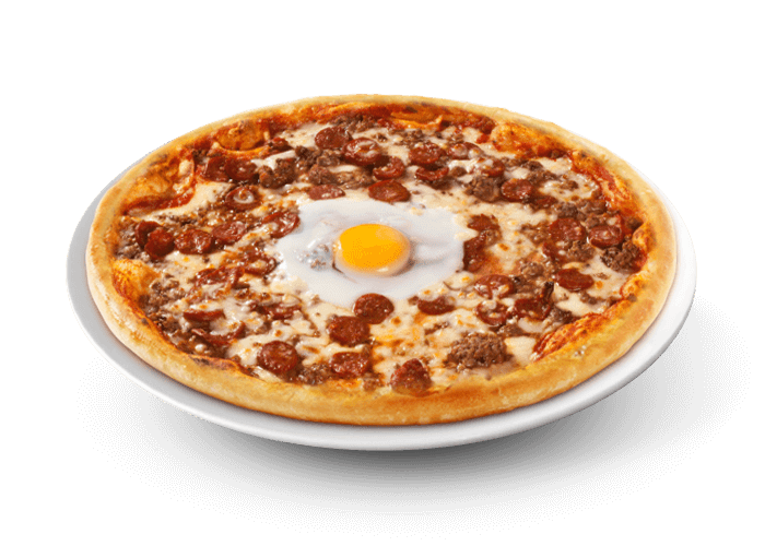 Tomato base, Mozza-Emmental, Minced meat, Merguez, Pepperoni, 1 Egg, Olives