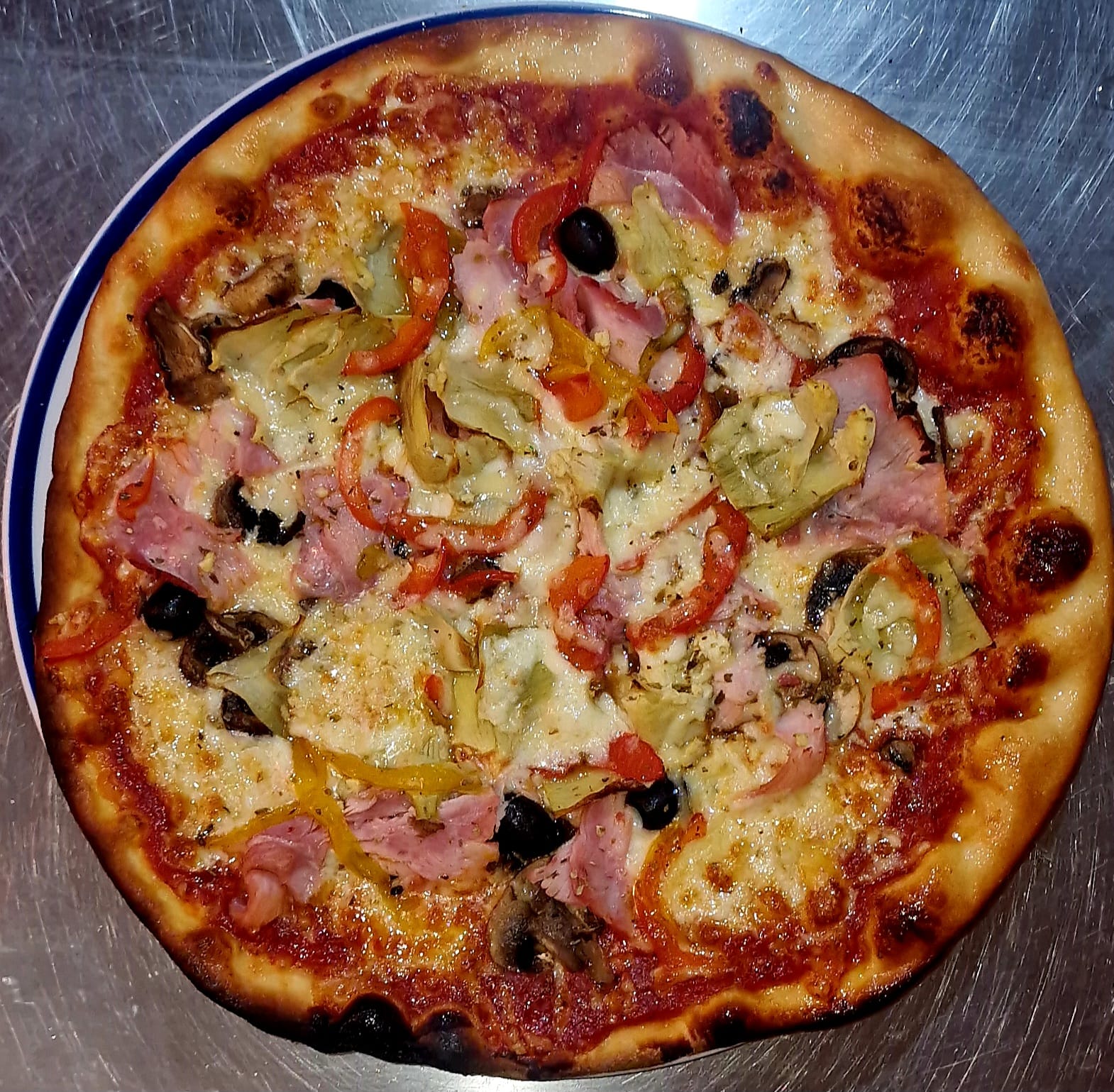 Base tomato, Mozza-Emmental, Mushrooms, Ham, Olives, Egg, Oregano