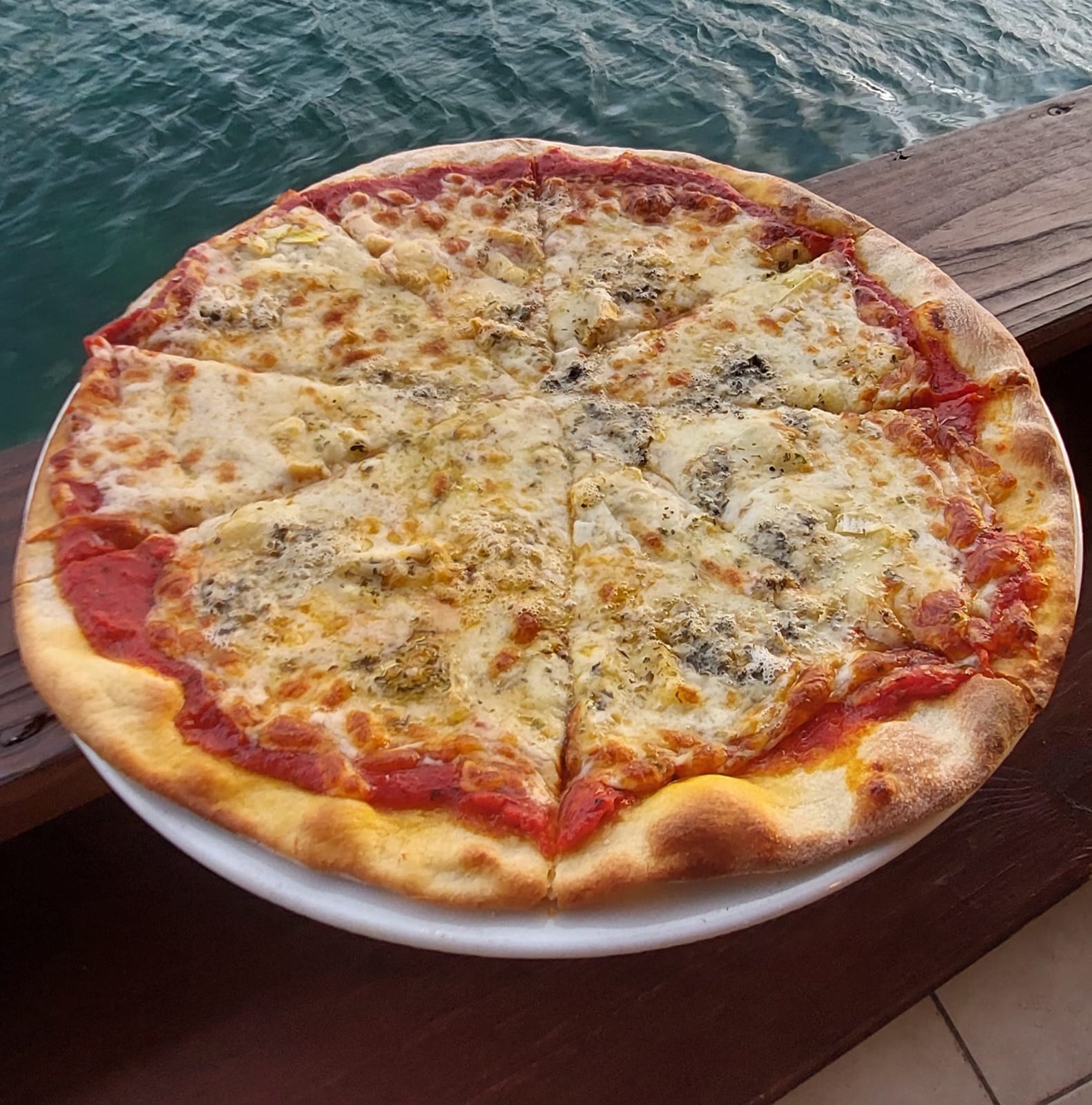 Base tomate, Mozza-Emmental, Smoked salmon, Cream, Olives, Oregano