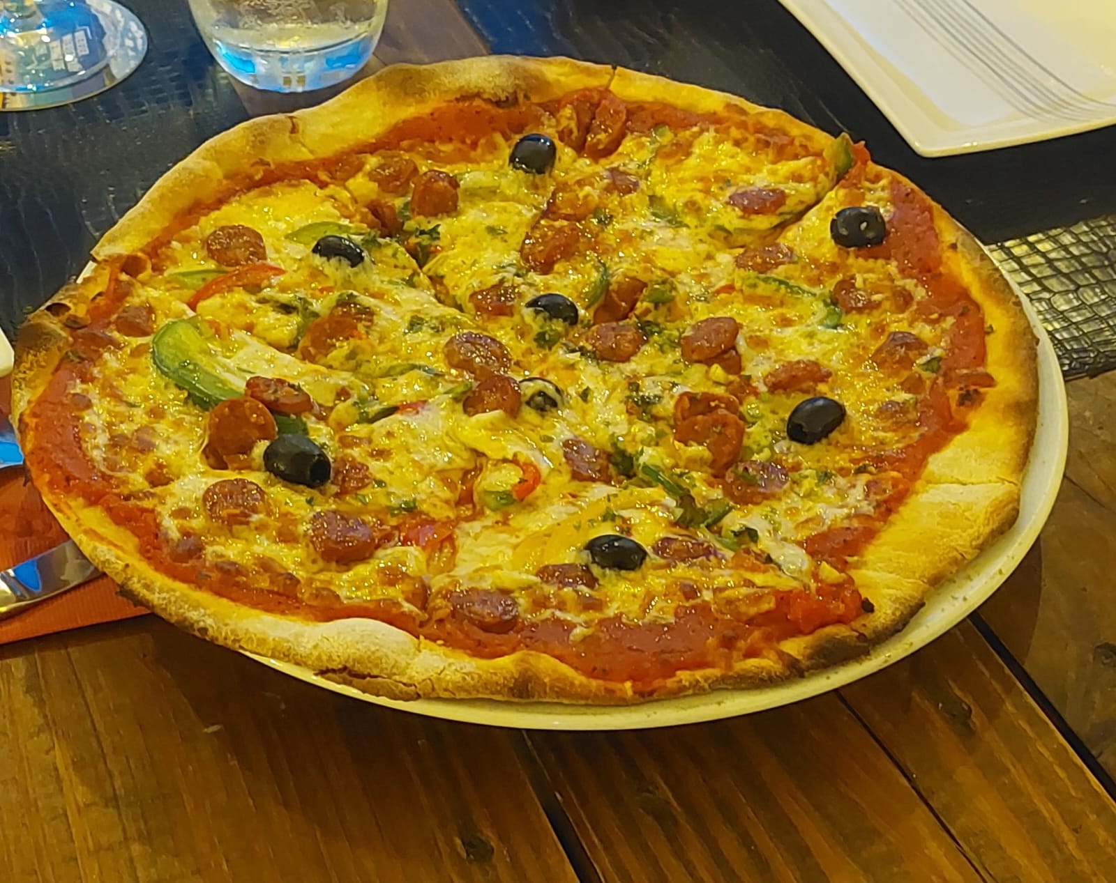 Tomato base, Mozza-Emmental, Merguez, Peppers, Olives, Oregano