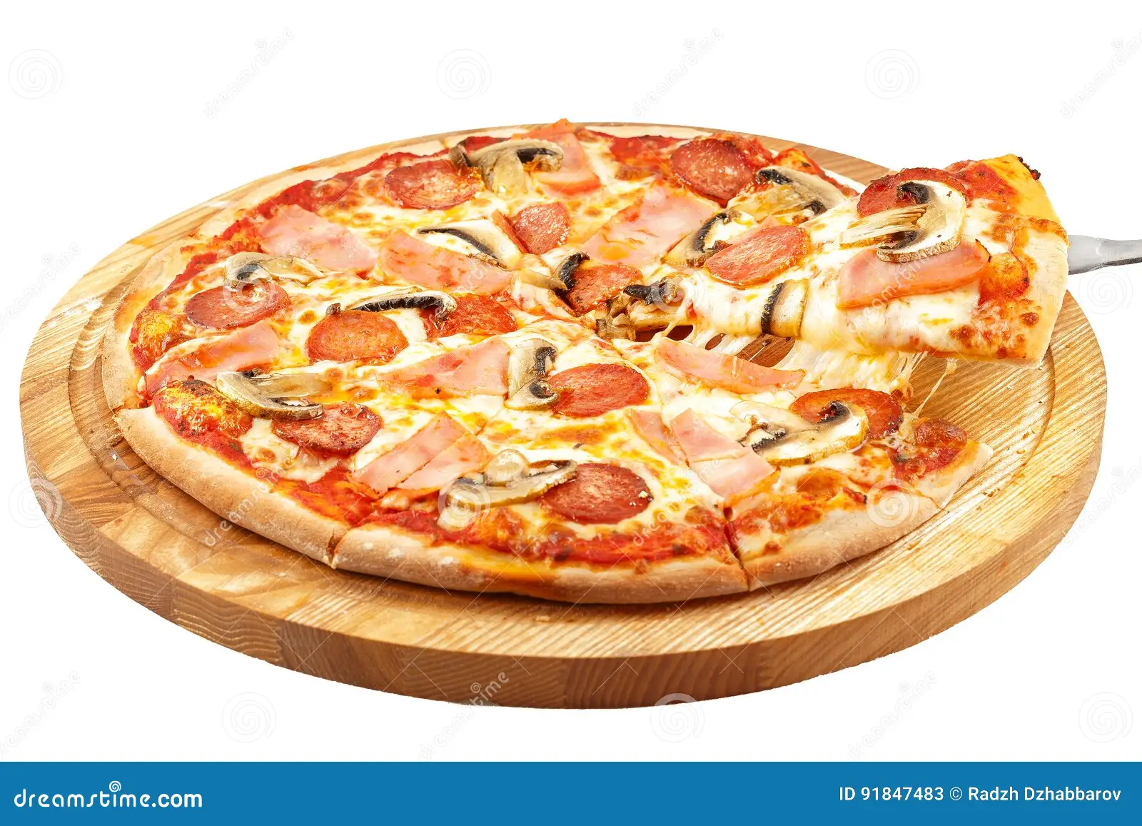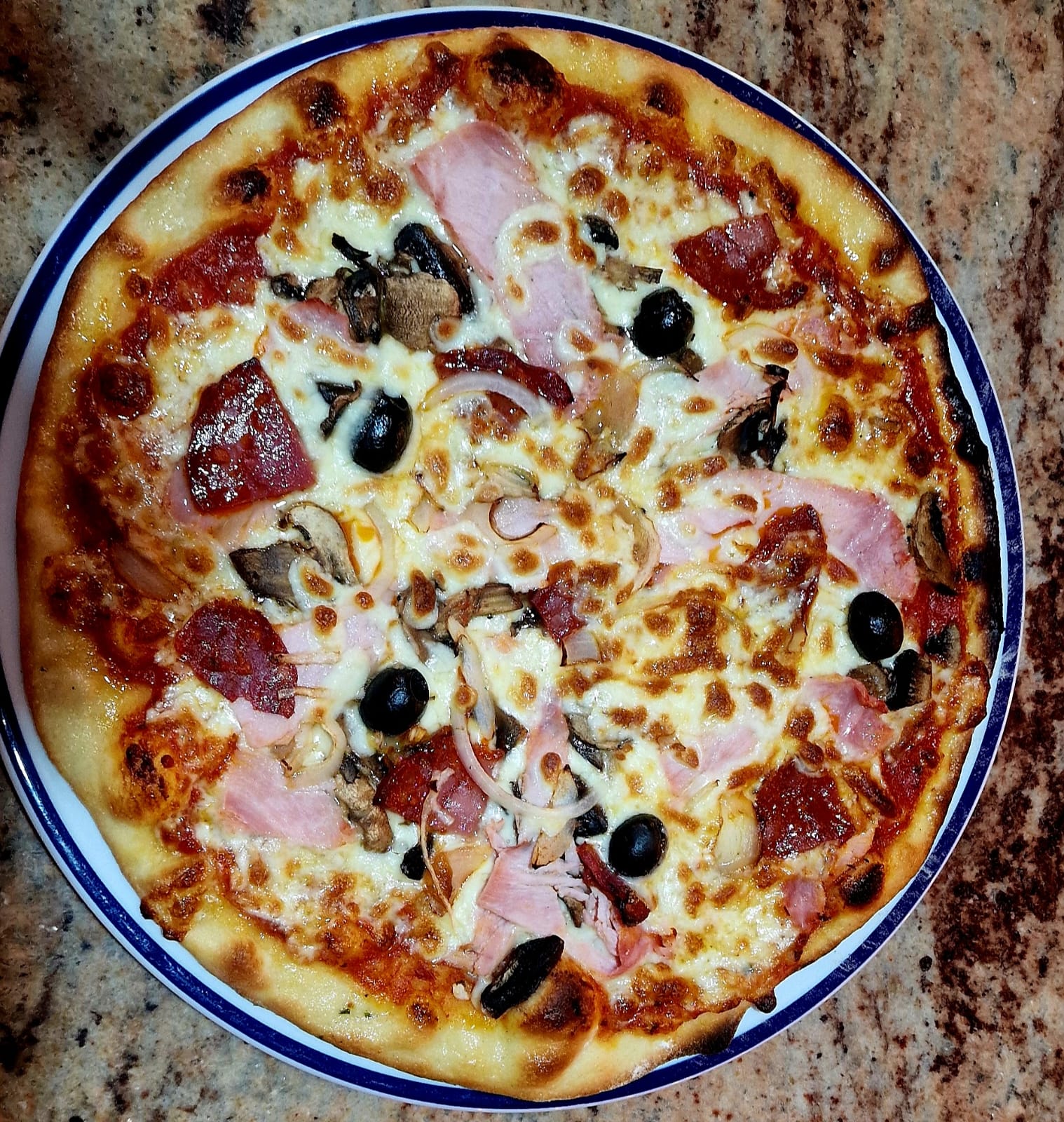 Tomato base, Mozza-Emmental, Mushrooms, Ham, Pepperoni, Onions