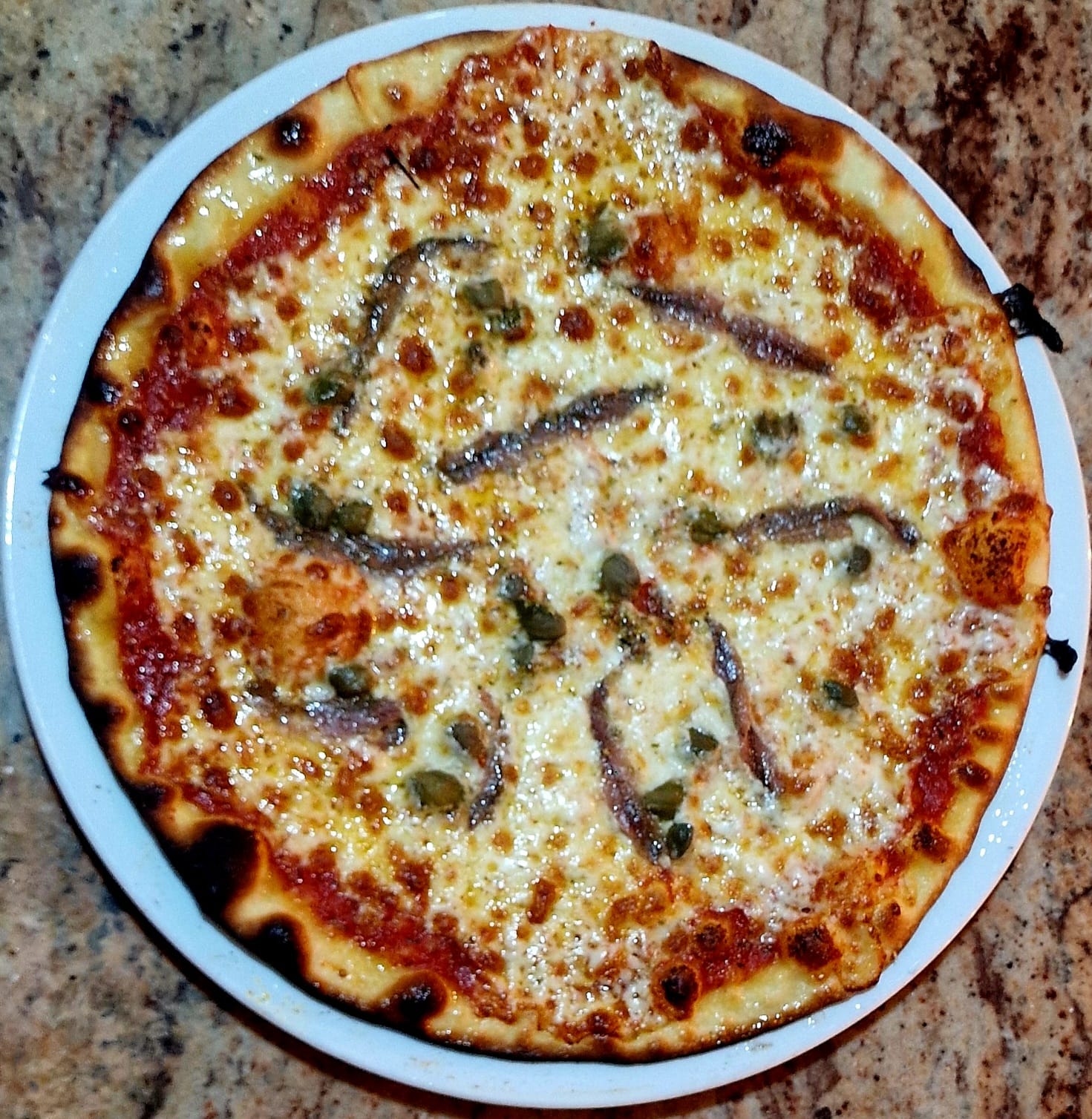 Base tomato, Mozza-Emmental,, Cheese, Anchovies, Capers, Olives, Oregano