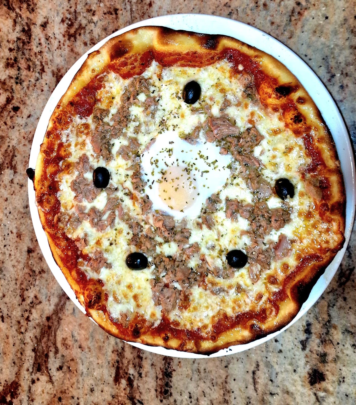 tomato base, Mozza-Emmental, Tuna, Egg, Parsley, Olives, Oregano